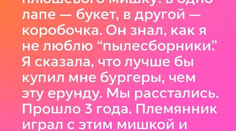 В один тихий вечер я села рядом с мишкой и вспомнила слова племянника: «Он скучал по тебе». Я поняла, что это не просто игра. Это был урок: иногда вещи, которые кажутся пустыми, имеют смысл. Иногда воспоминания, которые мы пытаемся забыть, на самом деле учат нас ценить настоящее.