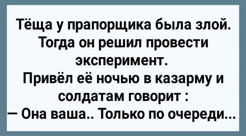 Тёща у прапорщика была злой. Тогда он решил провести эксперимент. Привёл её ночью в казарму и солдатам говорит: «Она ваша… Только по очереди…»