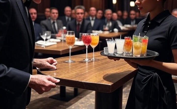 Амара подошла к их столику с подносом коктейлей. Она держала его уверенно, как всегда, скрывая усталость за маской спокойствия. Но в тот момент, когда она ставила бокал перед одним из гостей, сосед случайно толкнул стол локтем.
