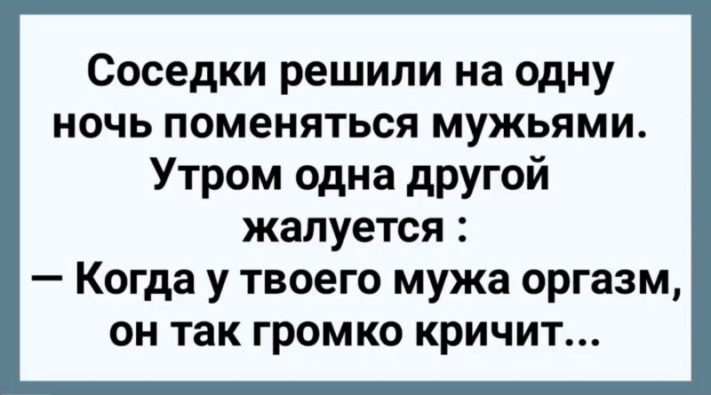 Соседки решили на одну ночь поменяться мужьями. Утром одна другой жалуется: «Когда у твоего мужа оргазм, он так громко кричит…»