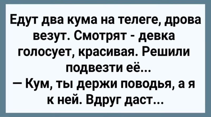 Едут два кума на телеге, дрова везут. Дорога пыльная, лето жаркое, лошади фыркают, телега поскрипывает, а кумы уже с утра успели по стопочке принять — настроение бодрое, разговоры пошли философские. Один кум, Фёдор, мужик лет под пятьдесят, пузо впереди него едет, усы закрученные, глаза хитрые. Второй — Степан, помоложе, худощавый, но язык острый, вечно шутки отпускает.