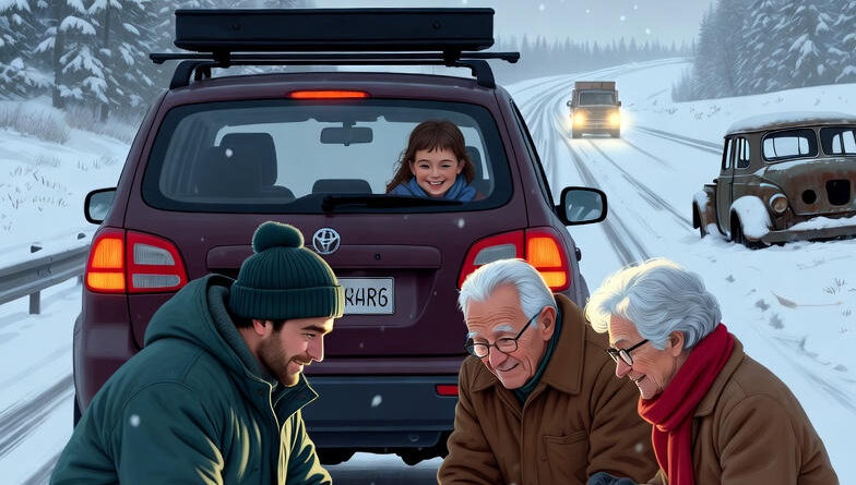 Старенькая серая «Тойота», которая выглядела так, будто ей давно пора отправиться на покой. Рядом — двое пожилых людей. Мужчина держал в руках домкрат, но видно было сразу — он уже час пытается понять, что делает не так. Женщина стояла, обхватив себя руками, и дрожала не только от холода.