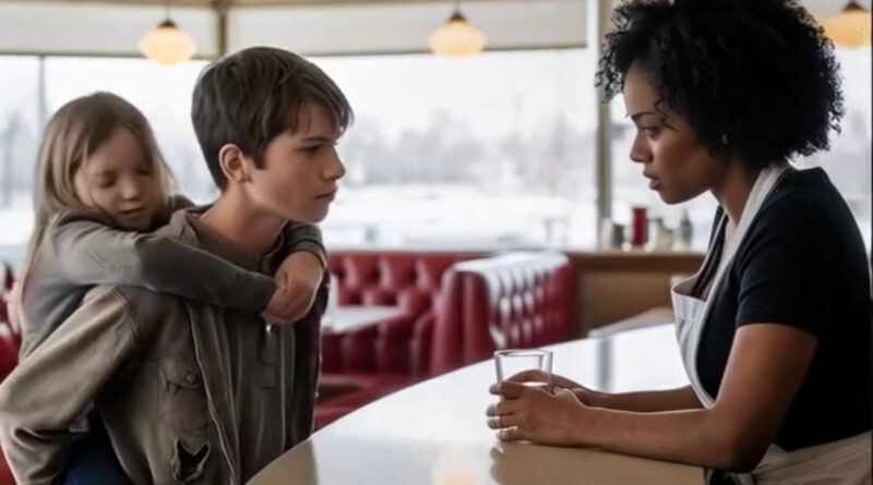 Марлен Картер стояла за стойкой, вытирая её тряпкой, когда внезапно дверь распахнулась. Влетел порыв ледяного ветра, за которым последовали две худые фигуры. Один из них — мальчик лет двенадцати, худощавый, с напряжённым взглядом, словно он нес тяжесть всего мира на своих плечах. На спине у него висела маленькая девочка, не больше шести лет, спрятавшая лицо в его плечо. Её волосы были растрёпаны, одежда порвана, а глаза, едва выглядывающие из-под локонов, выражали одновременно страх и усталость.