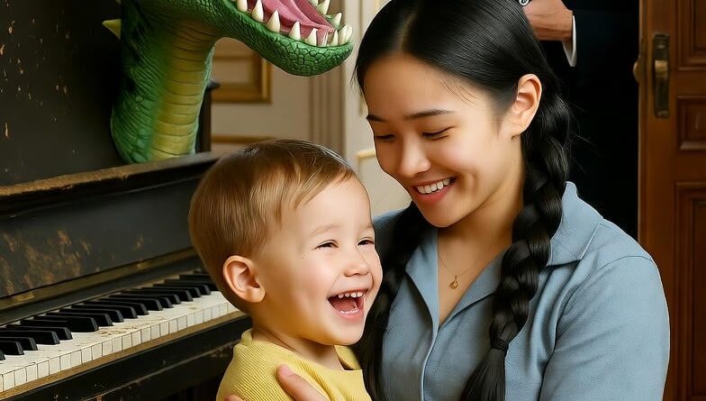 В гостиной Клара, простая девушка с косами, изображала динозавра, с веником на голове, а Лукас, сияя, смеялся, хлопая в ладоши.