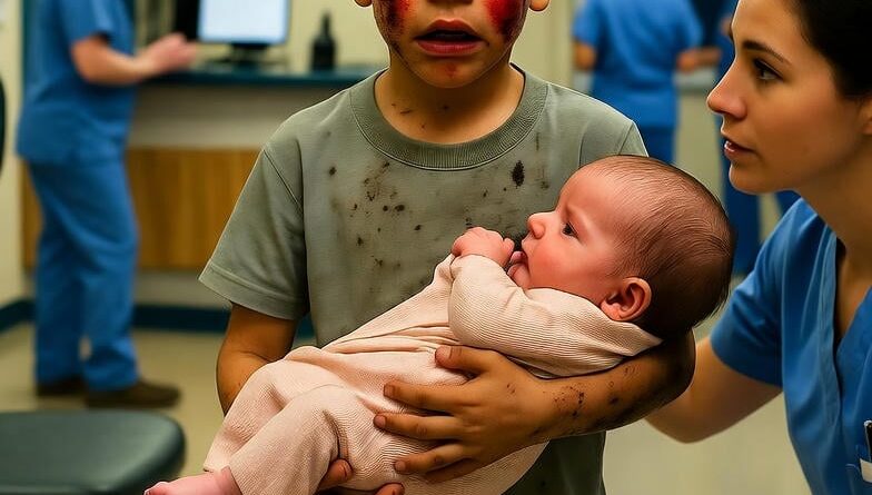 Ночь была холодной и тёмной, когда маленький Тео Беннет, семилетний мальчик с синяками на руках, дрожащей походкой вошёл в автоматические двери отделения неотложной помощи больницы Святой Екатерины. В его руках находилась младшая сестра, окутанная тонким розовым одеялом. Лёд зимнего воздуха мгновенно ворвался за его спиной, кусая голые ступни, а тишина пустого холла сделала каждый шаг слышимым, словно раздавался каждый его страх.