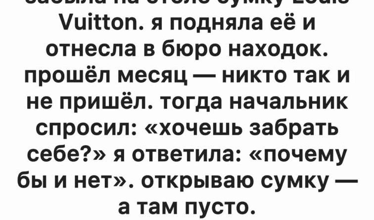 С другой — как часто в жизни ты получаешь возможность бесплатно получить сумку, на которую нужно откладывать несколько зарплат? И вообще — она же никому не нужна. Никто за ней не пришёл. Может, её специально оставили? Может, эта женщина… не знаю… не хотела её?