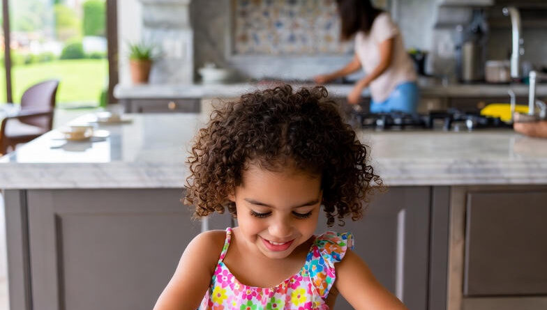 Он смотрел на маленькую девочку в углу кухни, которая сидела на полу, расчерчивая лист яркими линиями.